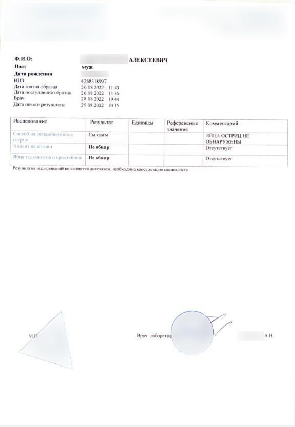 Оформить и купить Справку анализа кала - соскоба на энтеробиоз в нашей клинике - это просто и удобно. Просто предоставьте необходимые данные через WhatsApp и получите документ, который будет подтверждением вашего здоровья и отсутствия паразитических инфекций.